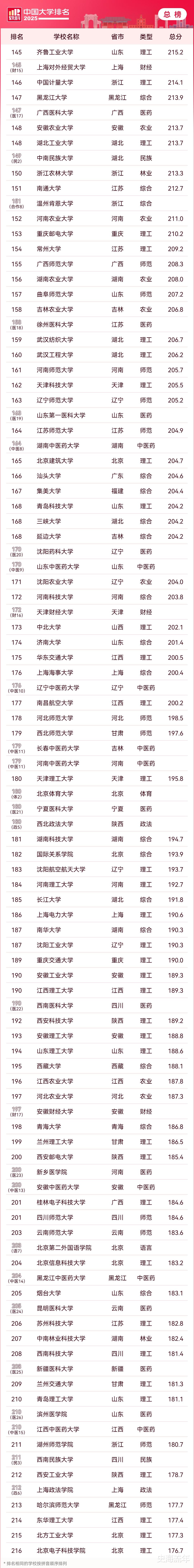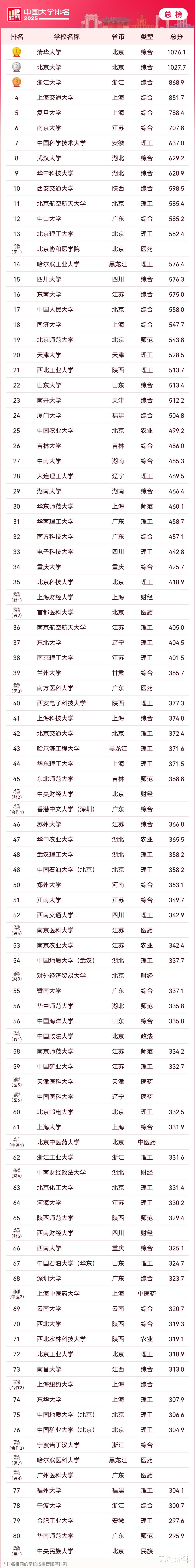 2025年4月15日,《2025年软科中国大学排行榜》发布。清华大学排名第一,北京大学排名第二,浙江大学排名第三,上海交通大学排名第四,复旦大学排名第五,南京大学排名第六,中国科学技术大学排名第七,武汉大学排名第八,华中科技大学排名第九。“武汉双雄”的排名仍然很亮眼。西安交通大学排名第十。