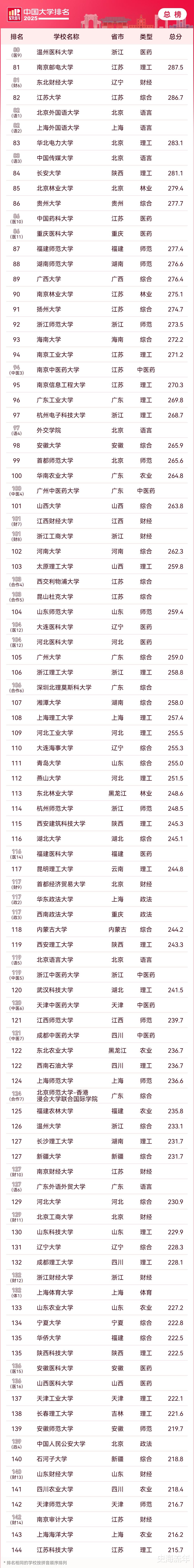 杭州师范大学排名第114位,浙江省第七位。温州大学排名第126位,浙江省排名第八位。中国计量大学排名第146位,浙江省排名第九位。浙江农林大学排名第150位,浙江省排名第十位。排名前200的高校,浙江省仅有10位,占比5%,优质高校数量有点少。