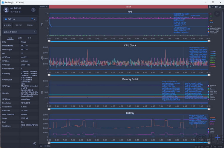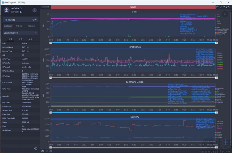 《原神》平均帧率60.2、平均功耗2811.0mW。四颗高频核心平均1GHz左右,四颗低频核心平均仅500MHz