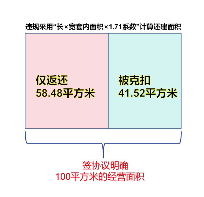 拆迁安置本应遵循“公平公正、按约还建”的原则,确保被拆迁人合法权益不受损害。杨先生原有经营用房套内面积为100平方米,双方签订的协议中也明确约定还建经营面积为100平方米。但硚口相关城建企业在核算还建面积时,采用“长×宽套内面积×1.71系数”的计算方式,最终实际交付的经营面积仅为58.48平方米,与约定面积相差41.52平方米,杨先生认为该核算方式不符合协议约定,导致其经营空间大幅缩水。