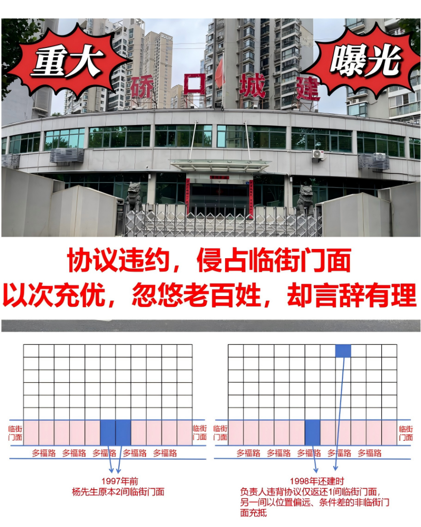 1997年9月29日,硚口区汉正街改造相关工作机构(后续因职能调整,相关事宜移交至硚口相关城建企业)与杨先生签订房屋产权调换拆迁协议及补充协议,明确约定杨先生可获得临街门面2间,且对门面位置、定位等信息有清晰记载。但在后续拆迁建设及交付环节,硚口相关城建企业实际仅交付1间临街门面,另一间则调整为位置相对偏远、条件存在差异的非临街门面,与协议约定内容不一致,导致杨先生预期的门面资产权益未能完全实现。