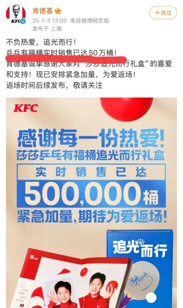 孙颖莎代言的肯德基一小时内卖出50万桶!这就是孙颖莎国民度的影响!肯德基出了一个套餐,“乒乓有福桶”里面不仅有汉堡九珍等,更有孙颖莎的周边,大家都是想去要孙颖莎的周边买的套餐!肯德基肯定也没想到孙颖莎有如此高的人气!