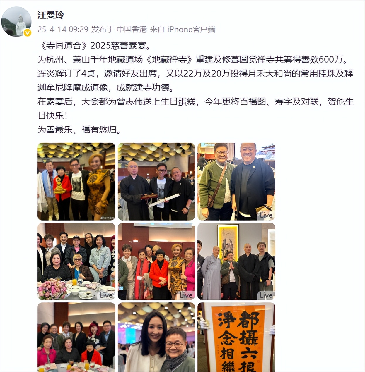 媒体人汪曼玲发文爆料,曾志伟通过这场宴席筹得600万善款,为杭州、萧山两地的千年地藏道场《地藏禅寺》重建及修葺,好友连炎辉订了4桌宴请大家出席,然后分别捐出22万及20万修建道像,大家吃完素餐后给曾志伟送上蛋糕和字画,祝他生日快乐。