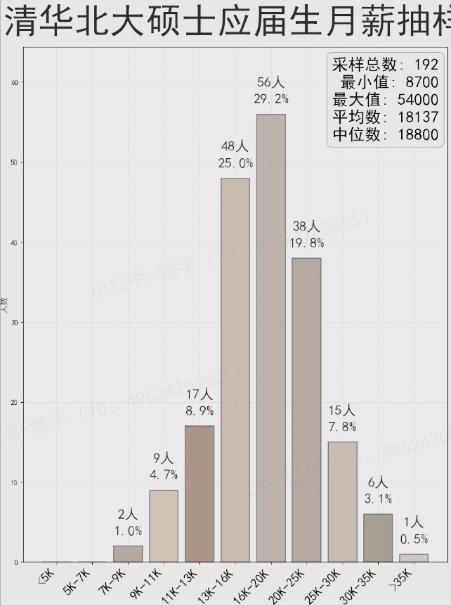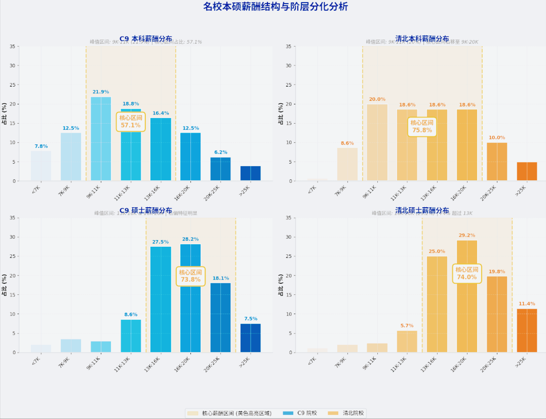 清北本科的分布结构大体差不多,只是整体往右边移动了一格,9K-11K同样是峰值(占比20%), 可是13K-16K和16K-20K的占比都达到了18.6%,核心区间从9K-16K扩展到了9K-20K, 这也就是说,清北本科在保持相同的中间厚度的情况之下, 把更多的人推进到了16K-20K这个更高的薪资区间里面。