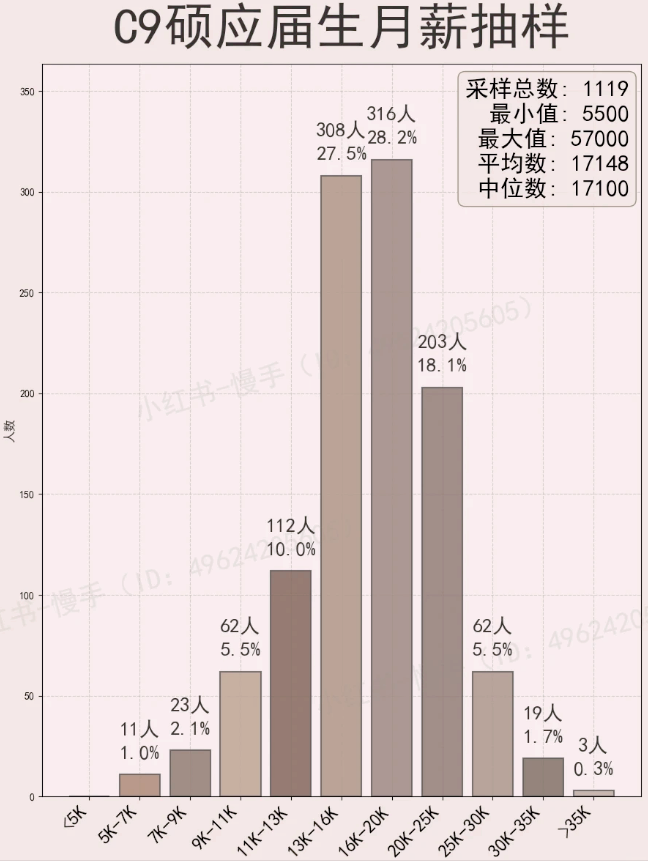 C9本科的薪酬最高点集中在9K到11K这个范围,占比21.9%, 再加上11K到13K以及13K到16K,三个范围总共57.1%,换句话说,超过一半的C9本科毕业生月薪在9K到16K之间,这是大众精英的典型范围。