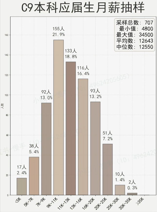 一份抽样数据包含了707个C9本科生、141个清北本科生的应届月薪情况,出现了一个很多人没料到的情况,清北和别的C9的最高月薪差不多没什么差别, 真正拉开差距的,是薪资的最低价。