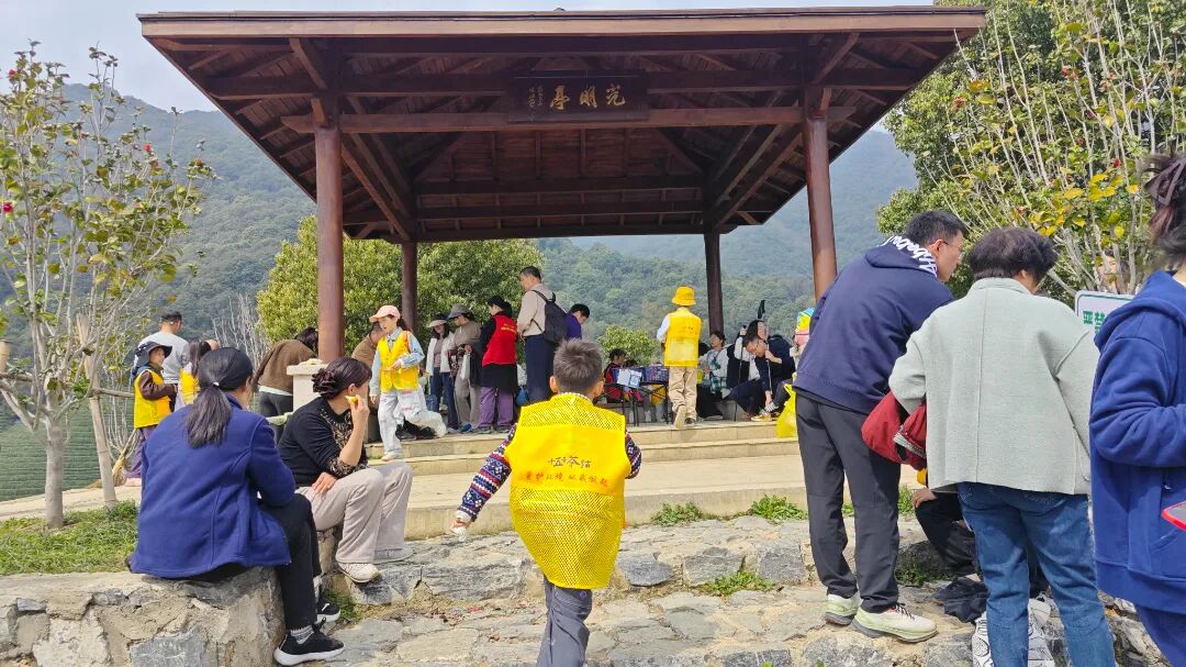 看,绿油油的茶树间,几抹亮黄色的身影格外显眼。大人提着袋子,小朋友也戴着小手套,每个人都认真地边走边看。