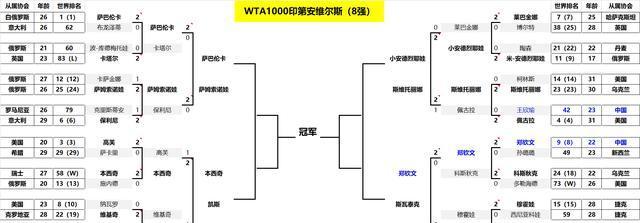 北京时间3月14日凌晨,WTA1000印第安维尔斯站开始正赛第9日的比赛了。经过8个正赛日,八强都已经确定(对阵情况看下面的图表)。到了3月14日凌晨,首先进行的一场1/4决赛特别受,是中国球员郑钦文和波兰名将斯瓦泰克的比赛,下面说说详细情况。