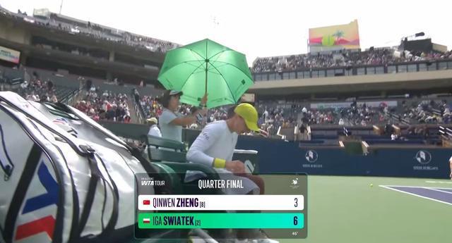 第7局,这是郑钦文在这场比赛里必须保住的发球局。郑钦文以40 - 0拿到了3个局点,斯瓦泰克挽救回1个局点。就在这个时候,现场顶着太阳却下起雨来,这场景确实很罕见。郑钦文主动提出暂停比赛,按照规则,现场要是受到极端天气影响是能够中断比赛的。
