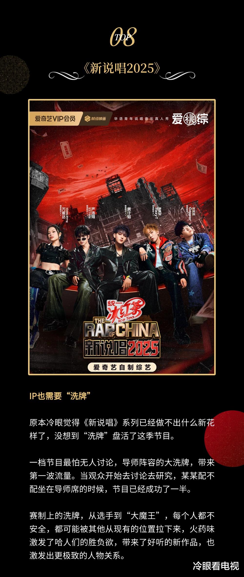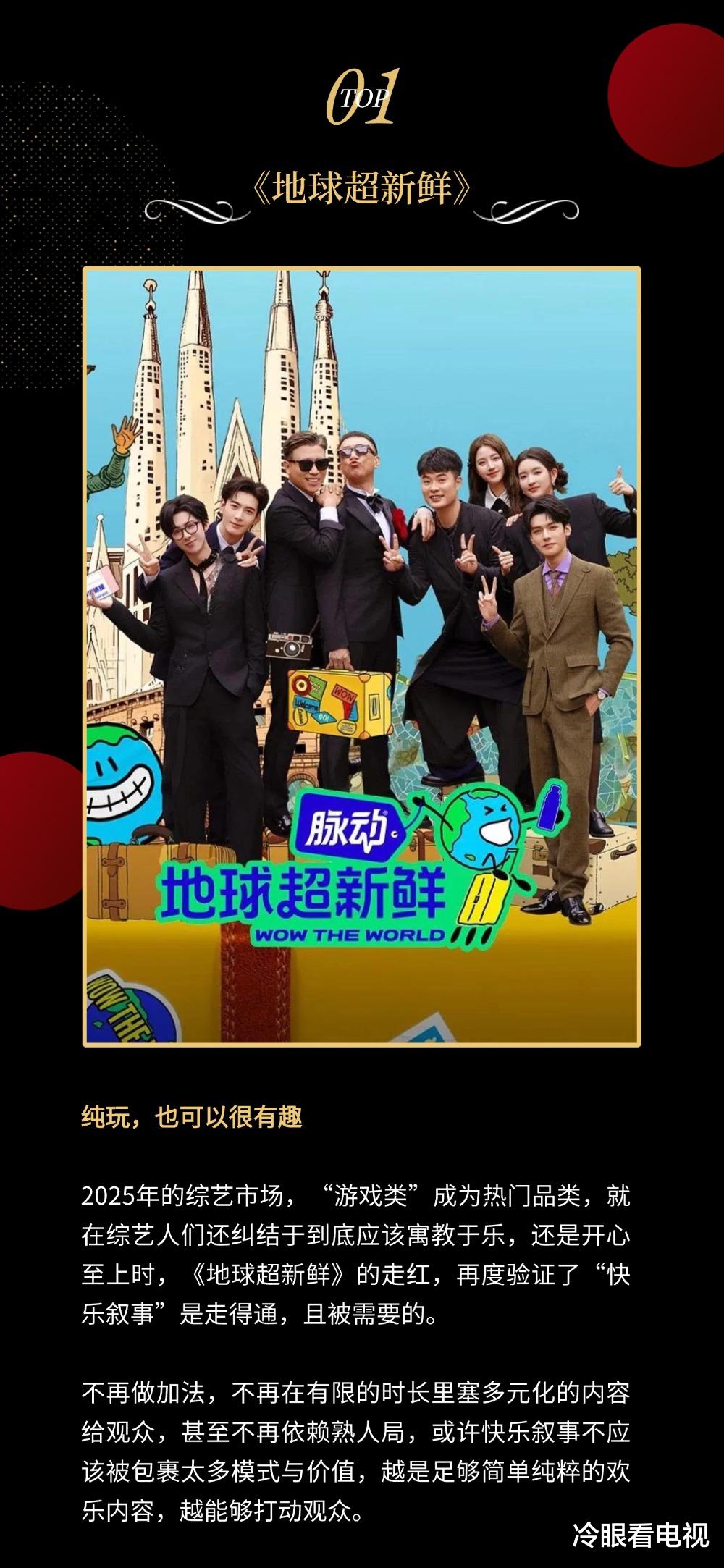 2025年是很难被定义的一年。我们似乎很难用一个词去概括这一年市场上出现了什么统一的趋势,这一年综艺人们不再执着于去寻找某个共性的标准答案,而是根据市场情况及自身优势给出多样性的解答。因此今年的榜单,冷眼想把目光放在对社会情绪、对市场需要有洞察的节目组们身上,它们每一个都有一项做到极致的长板,让市场有了鲜活的模样,让观众看见多元的光亮。2025年,大家辛苦了!