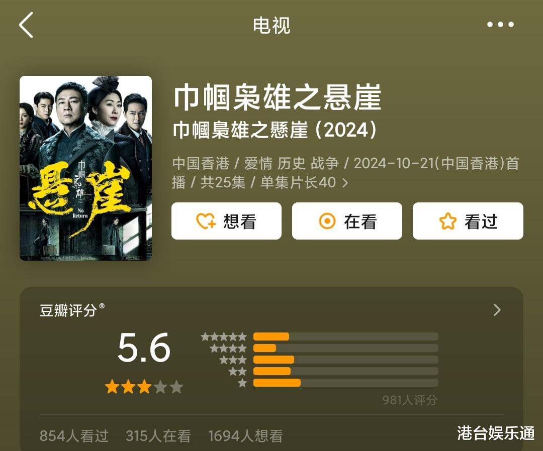 《巾帼枭雄之悬崖》(巾帼枭雄4)的评分最低,为5.6分,未达到及格线,而评分人数为981人,短评数量为387条,剧评数量为17条,小组讨论帖文为29条。当然,这部剧在内地平台仍处于播出阶段(注:已有超前点播),接下来评分仍可能有变化,短评、剧评、帖文也会有所增长。