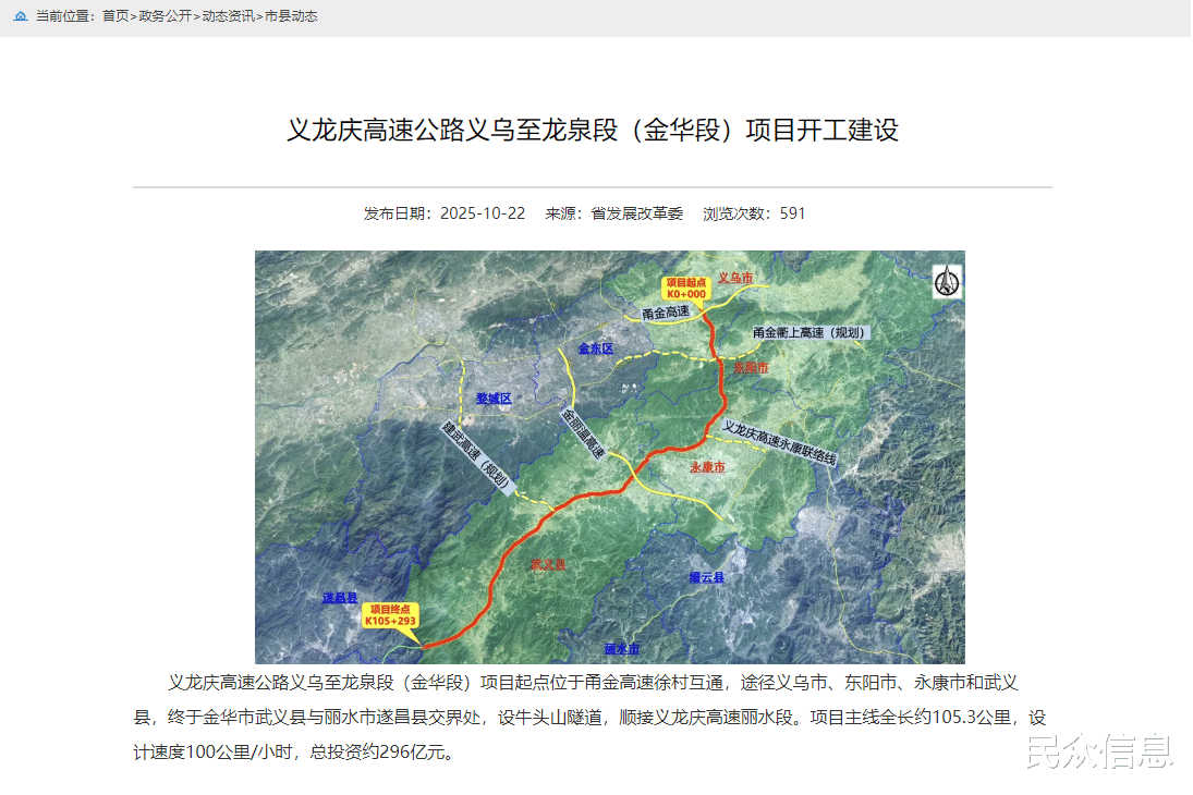 2025-10-22, 浙江省发展改革委在官网发布义龙庆高速金华段开工公告。