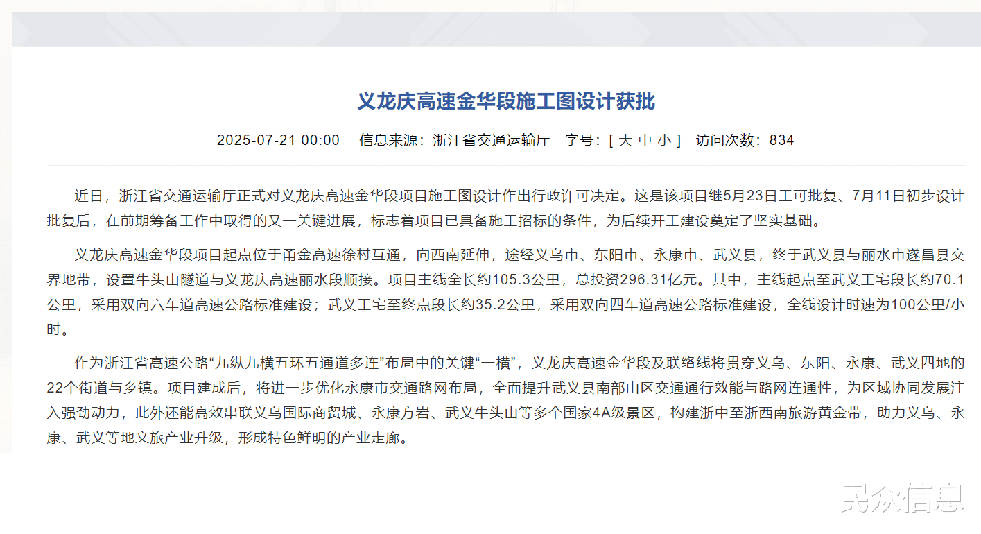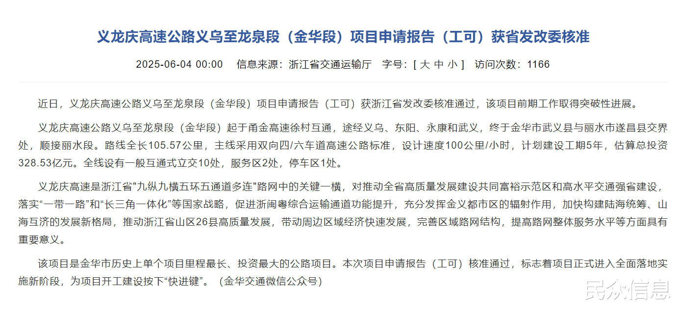 进入2025年,义龙庆高速(金华段)项目建设进程加快推进:2025 年 6 月4日,义龙庆高速公路义乌至龙泉段(金华段)获浙江省发改委核准。