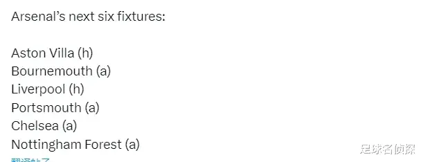 阿森纳未来6场比赛:主战维拉、客战伯恩茅斯、主战利物浦、客战朴茨茅斯、客战切尔西、客战诺丁汉森林。