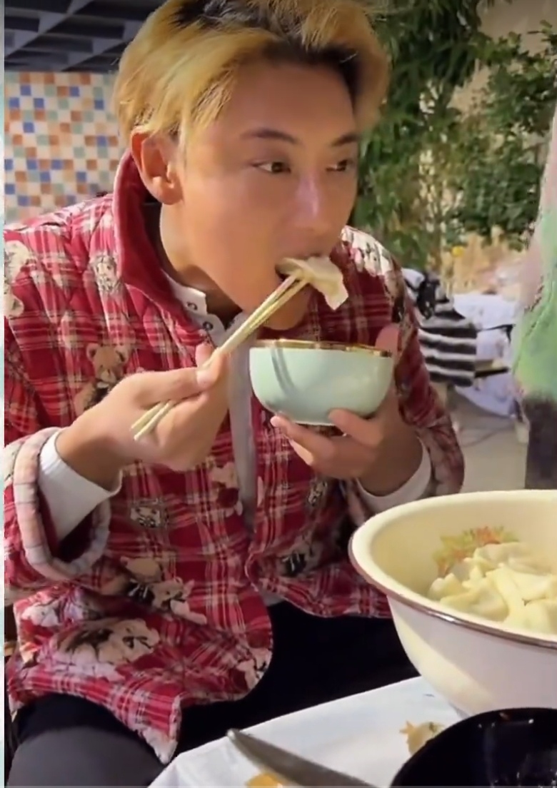 在徐艺洋老家的家庭聚餐直播中,黄子韬彻底颠覆了往日形象。他身穿一件红蓝大花夹棉睡衣,尺码明显不合身,肩膀处紧绷的剪裁与他那头金发形成戏剧性反差。镜头里,他毫无偶像包袱地大口撸串、端着自制油炸饺子蘸红油辣子,甚至用山东口音调侃"下次带醋来中和川味"。