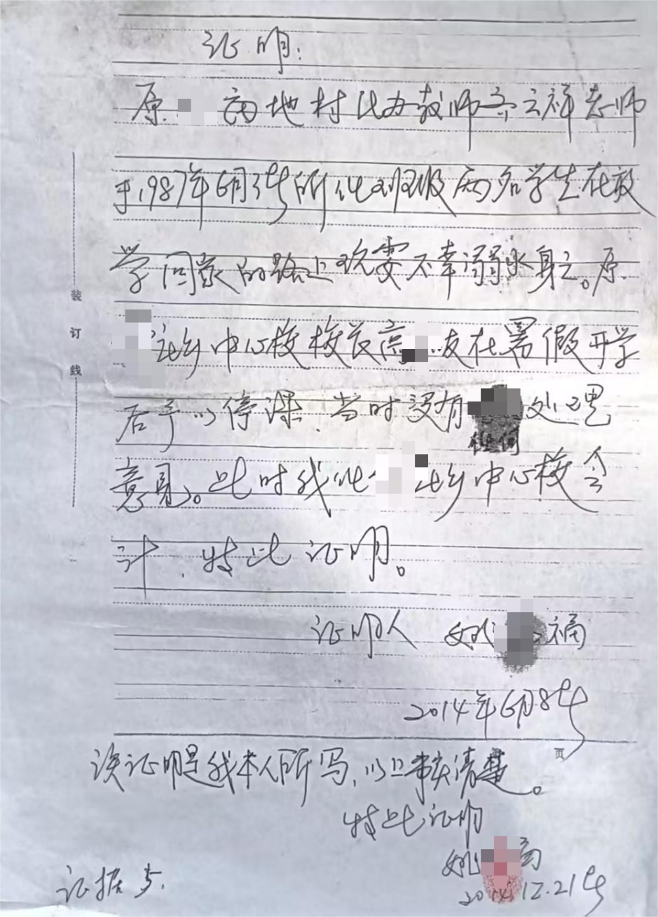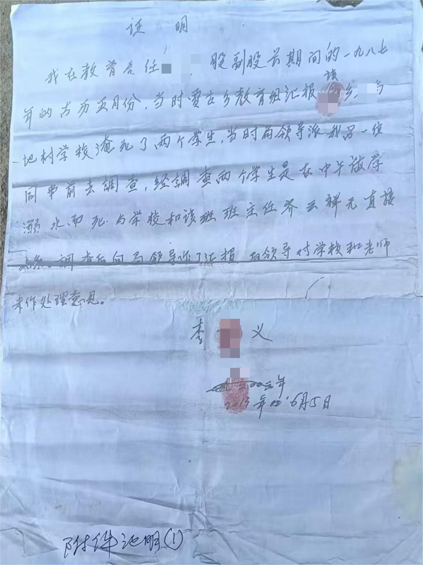 齐云祥指出,在当时没有教师编制的情况下,只有借题发挥伪造辞退他,才可以让高某堂取得这个位置。齐云祥所教班级1987年6月3日中午放学后有两名小学生在校外水井溺亡是实事,可据其透露,当时县教育部门派2名工作人员联合贾某乡及乡中心小学形成调查组,由李某义任组长调查后并在某亩地小学召开会议、并宣布认定:“由于中午放学后发生的溺亡事件、与学校和任课老师没有直接关系”,后来李某义组长写证明证实了上述定论。