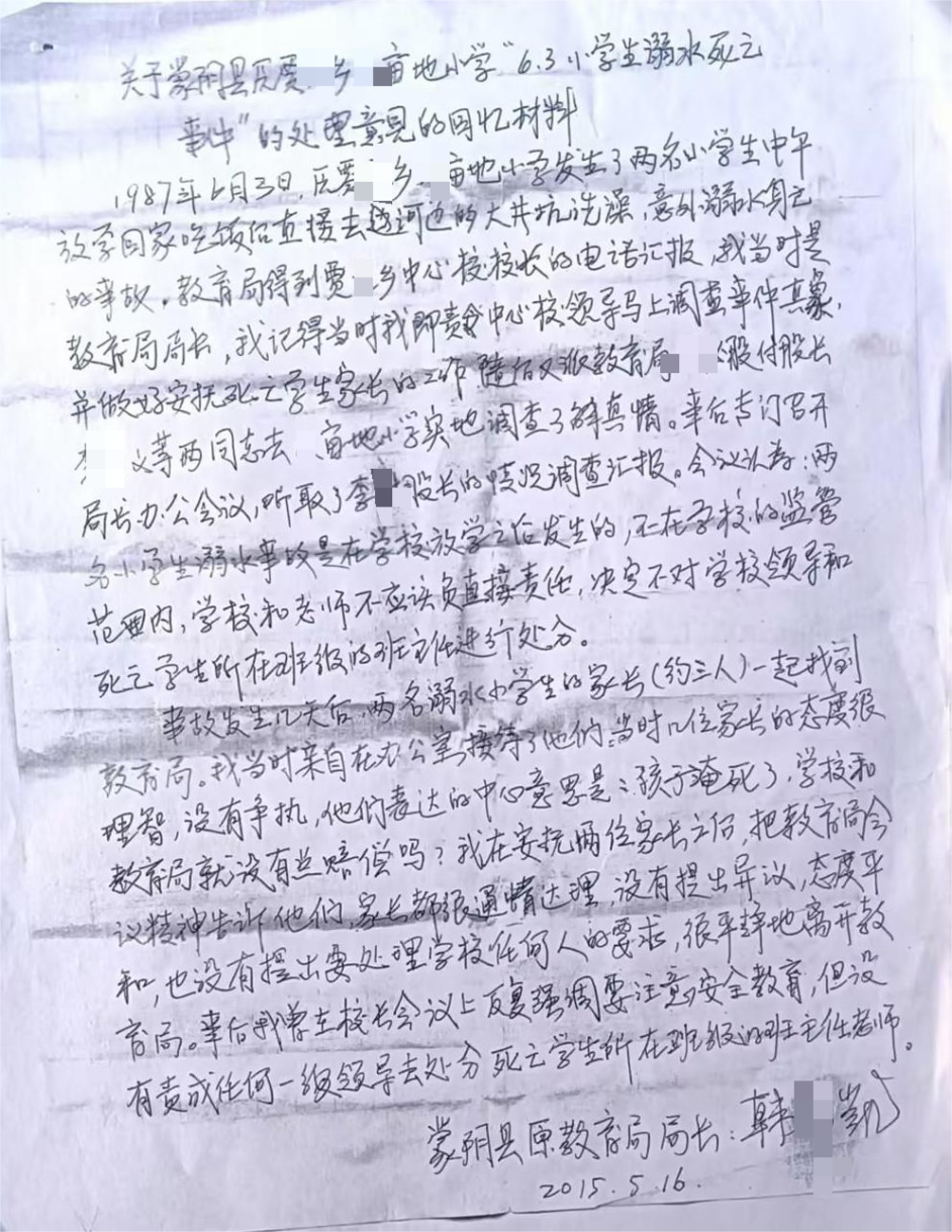 原县教育部门局长韩某凯的证明是:“某亩地小学溺亡事件发生后、教育部门开了局长会议并听取了李某义组长的调查汇报、会议认为两名小学生溺水事故是在学校放学之后发生的,不在学校的监管范围内,学校和老师不应负直接责任,决定不对学校领导和死亡学生所在班级的班主任进行处分,事后我也没有责成任何单位、任何人去处分死亡学生所在班你的班主任老师”。