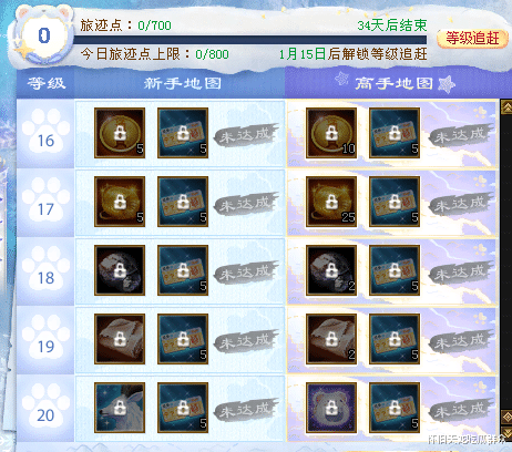 解锁高手地图有点数加成:2025年12月18日至2026年1月4日期间,少侠可花费元宝解锁高手地图,解锁后不但可在升级新手地图时获得更多珍稀道具奖励,还可在参与活动与副本时额外获得50%的旅迹点,每日可获职旅迹点上限也将扩充至1200点。