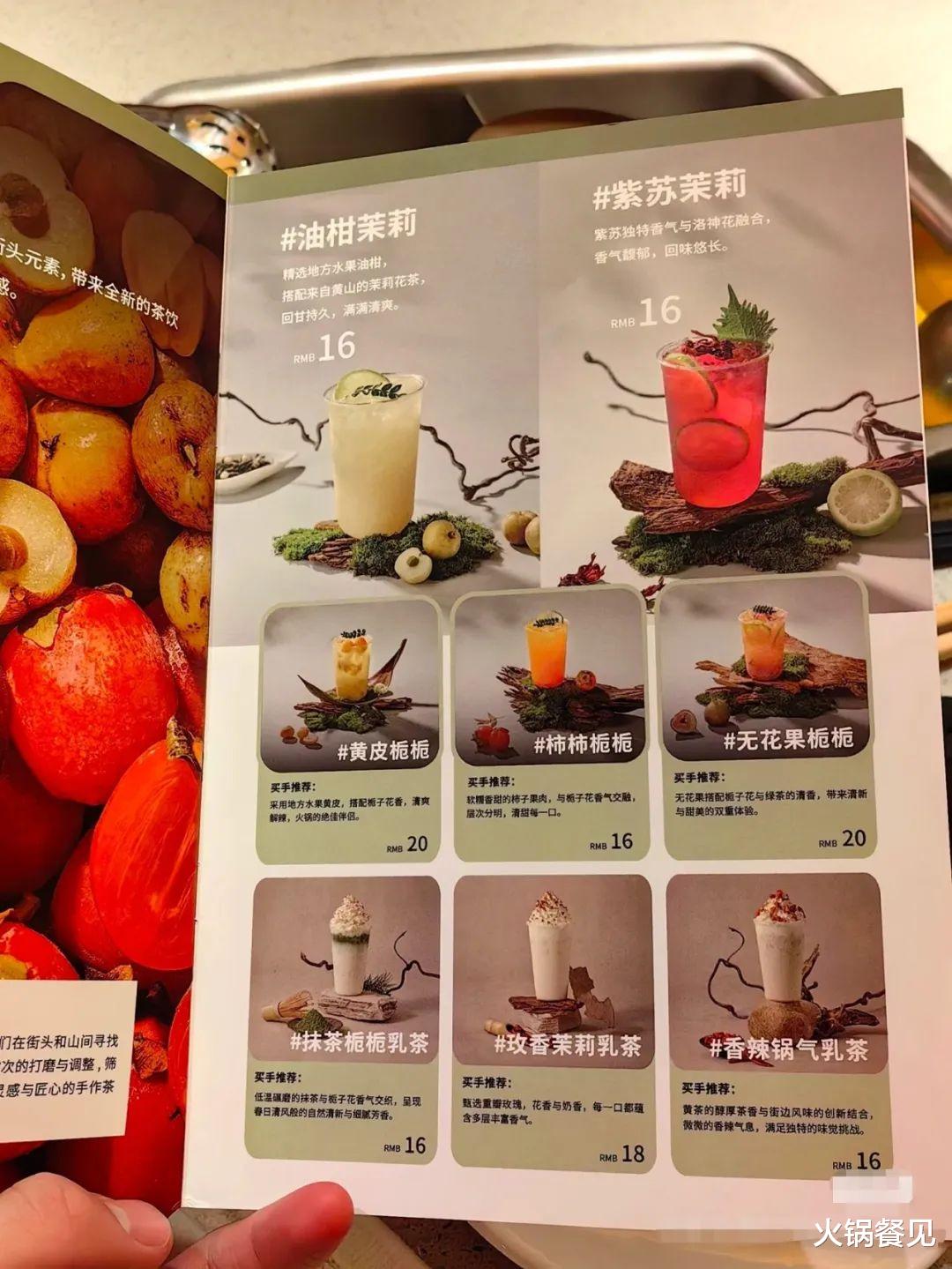 一般而言,火锅店多以手打柠檬茶为主,在海底捞买手店饮品大体可分为俩大类,偏清爽口感的饮品,比如,油柑茉莉、紫苏茉莉、黄皮栀栀、无花果栀栀等,售价16-20元;另一类乳茶奶油顶,如香辣锅气乳茶、玫香茉莉乳茶等,售价在16-18元。