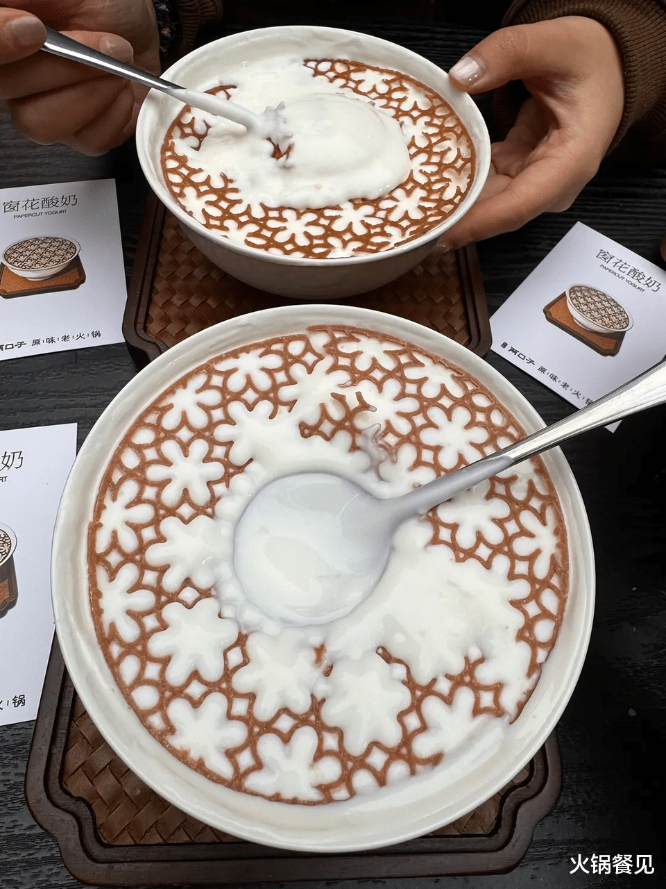 此外,在各地火锅店流行的窗花酸奶,也成为火锅星人的打卡利器,换个展示方式与吃法,这种微创新的形式,最“吃”年轻顾客。