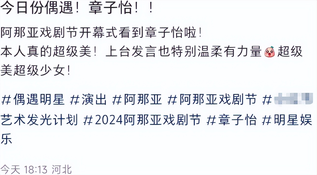 6月20日傍晚时分,不少网民发帖称“在阿那亚戏剧节开幕式看到章子怡啦”,并赞其“本人真的超级美,上台发言也特别温柔有力量,是个超级美少女”,吸引不少网友的讨论。