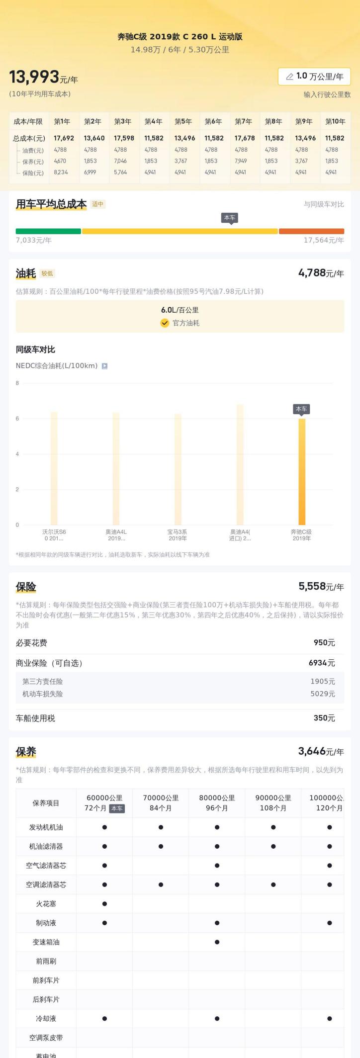 除了以上提到的几点,我们还需要考虑用车成本。虽然奔驰C级的油耗表现还不错,但作为一辆豪华品牌车型,它的保养费用和维修费用相对较高。根据懂车帝的数据,这辆车的10年平均用车成本大约在1.36万元/年,这还不包括潜在的维修费用。因此,在购买之前,一定要做好心理准备,并根据自己的经济状况进行合理的评估。