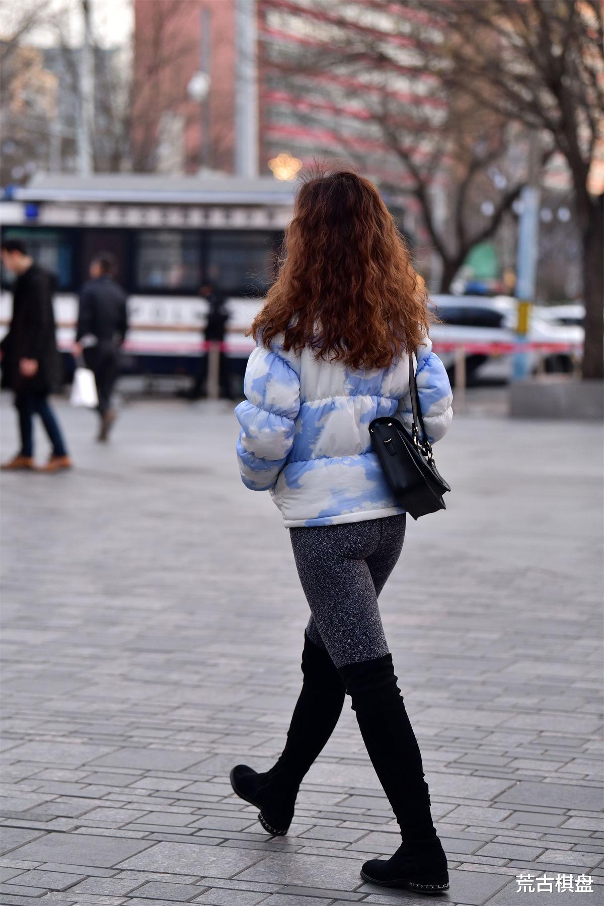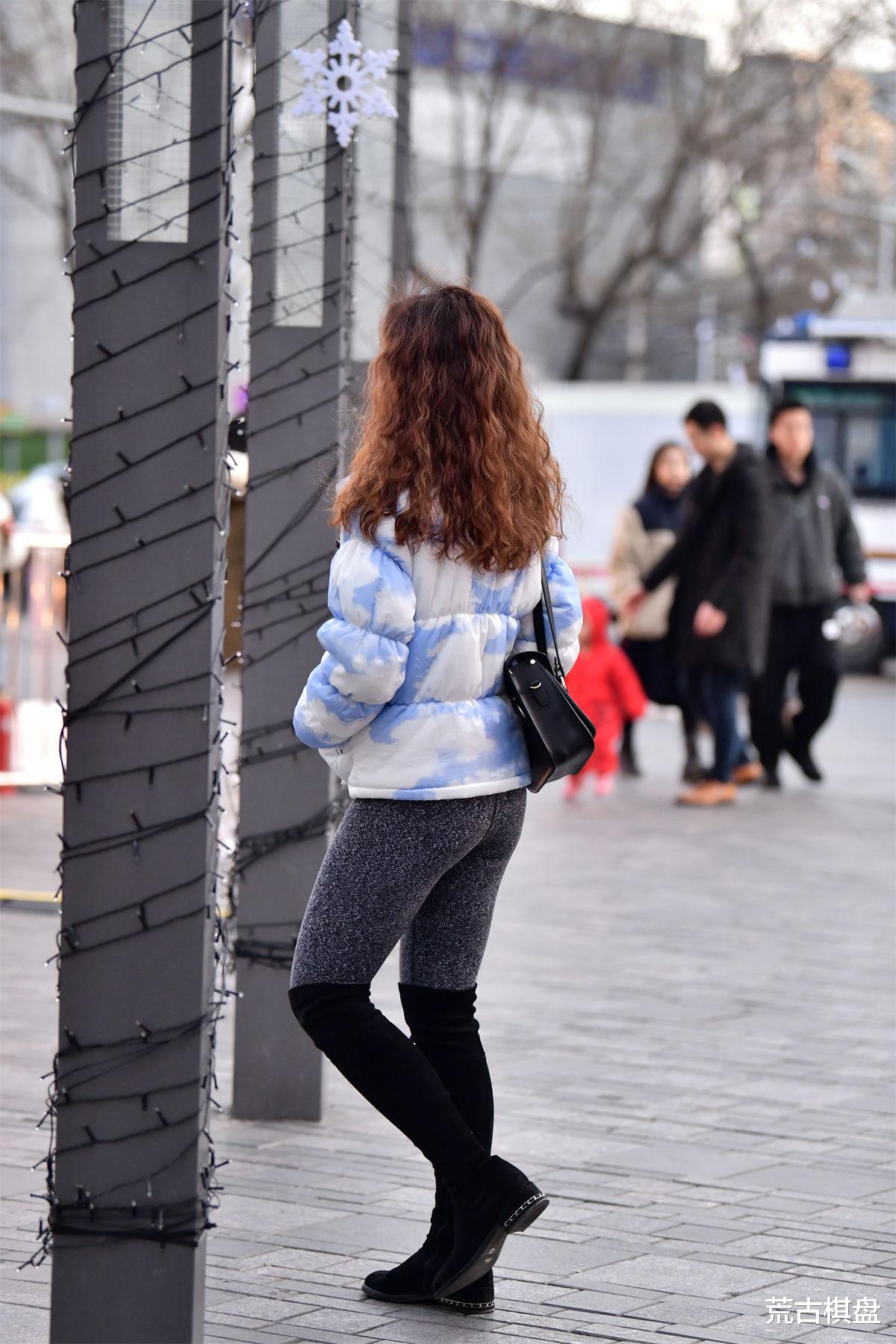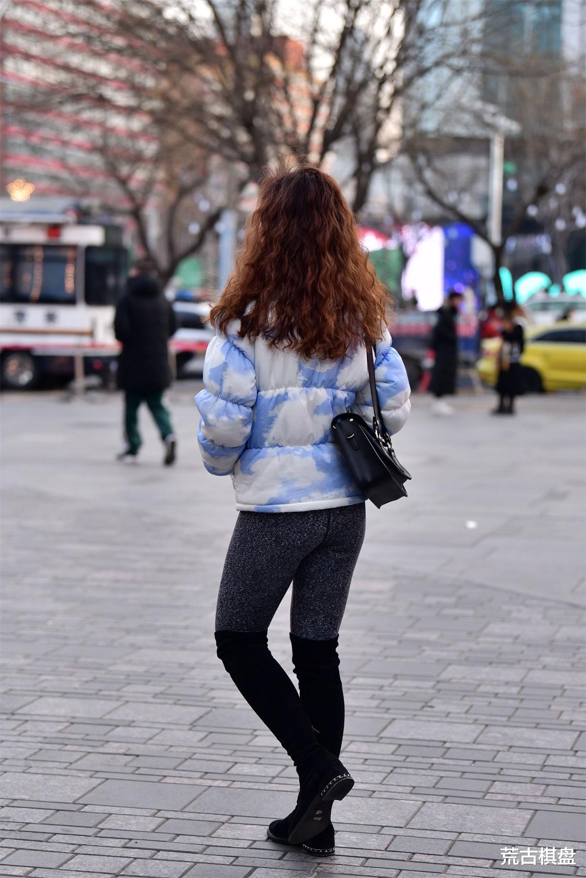 在灰与黑的沉稳基调上,蓝白色短款羽绒服如同一缕清风,为整体造型注入了生机与活力。蓝白色系,自带清新脱俗的气质,无论是天蓝还是湖蓝,都能给人以宁静致远的感受。短款设计,不仅能够有效提升腰线,拉长下半身比例,还能减少冬季穿搭的臃肿感,让整个人看起来更加轻盈灵动。羽绒服通常采用轻盈蓬松的填充物,既保证了足够的保暖性能,又避免了厚重感,是冬日里不可多得的时尚单品。当它与灰色鲨鱼裤和黑色过膝靴搭配时,蓝白色的清新与下装的沉稳形成了鲜明对比,既平衡了整体色调,又提升了穿搭的层次感。