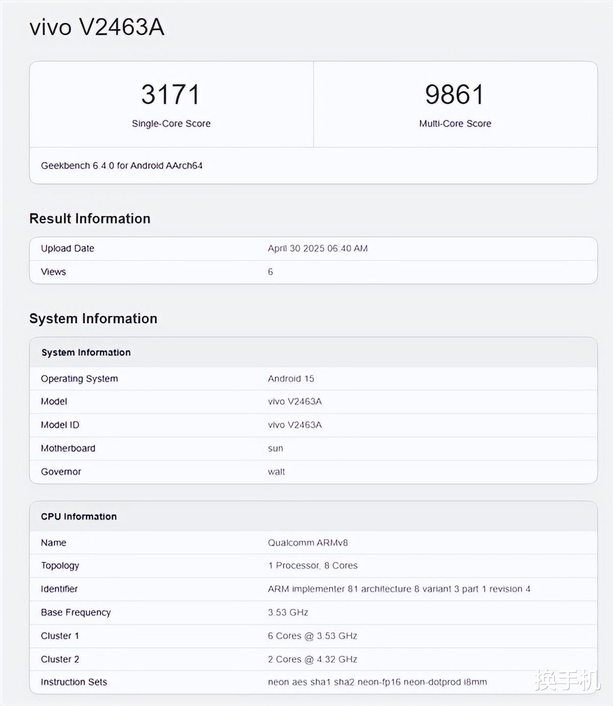 5月5日,型号为V2463A的iQOO新机,现身Geekbench跑分网站。数据显示,该机的单核成绩3171,多核成绩达到了9861,预计是属于iQOO Neo10系列的iQOO Neo10 Pro+。
