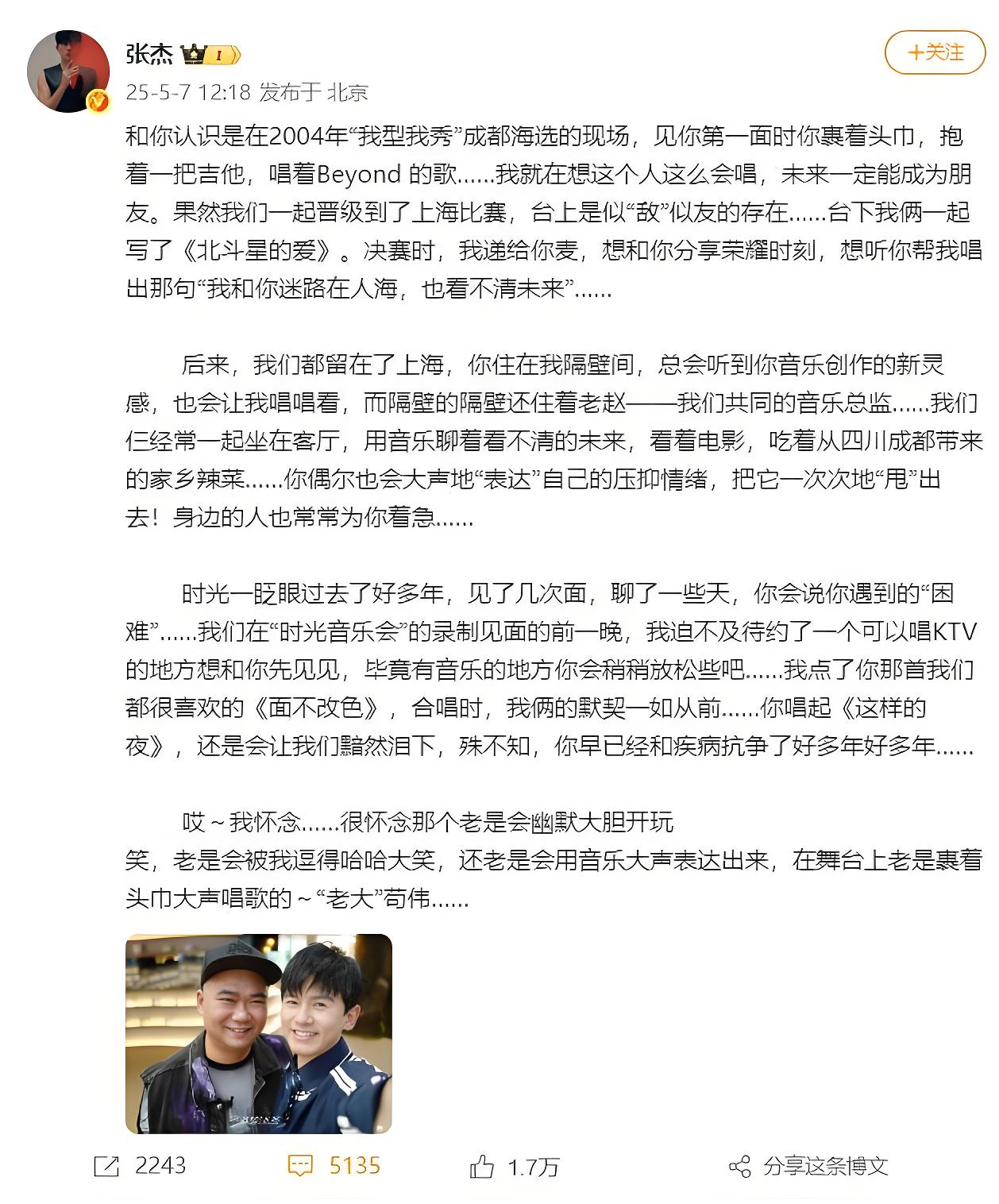 2025 年 5 月 7 日中午 12 点 34 分,张杰的微博突然被一条长文刷屏。这位华语乐坛顶流歌手罕见地放下舞台上的光芒万丈,用颤抖的笔触写下:"我不知道你和病魔抗争了好多好多年……" 配图是 2004 年《我型我秀》决赛夜的黑白合照 —— 两个青涩少年紧握话筒,背后是沸腾的红色舞台。这条微博瞬间引爆全网,阅读量 1 小时突破 2 亿,# 张杰悼念苟伟# #北斗星的爱创作背后的故事 #等话题轮番登上热搜。