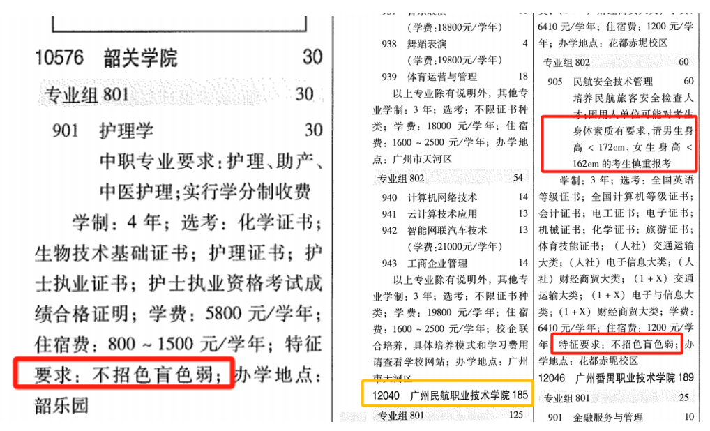 在今年的3+证书招生目录中,几乎所有对考生有特征要求的专业限制都为:不招色盲色弱、不招单色识别不全者。