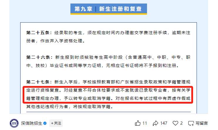 例如:深圳信息职业技术大学,深信打春季高考的招生章程明确新生入学后:学校按照教育部和广东省招生录取政策和学籍管理规定进行资格复查。