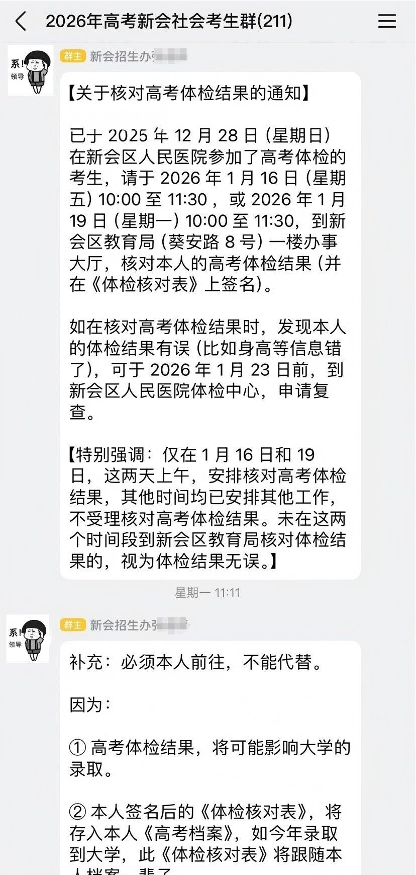 江门市新会招生办发布《关于核对高考体检结果的通知》,要求同学们于1月16日或19日到现场核对高考体检结果并签名,且需要本人前往,不能代替!有异议可在1月23日前申请复查