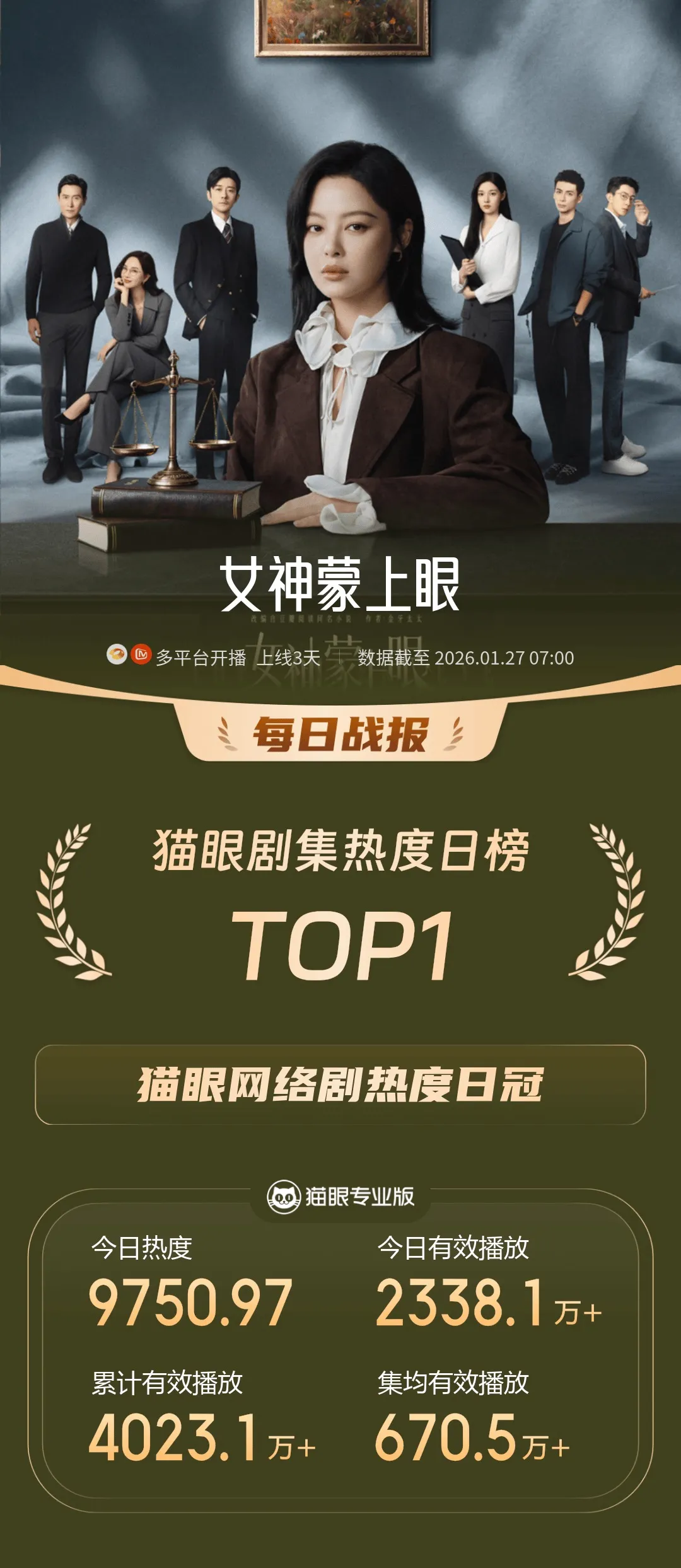 这样的主创组合,这样的播出数据,不禁令人好奇:这一次,辛芷蕾诠释了一名怎样的律师角色?在当代社会共识愈发难以凝聚的当下,《女神蒙上眼》是否能以扎实的笔触,在都市情感这一类型中,呈现更具现实肌理与人性深度的故事?