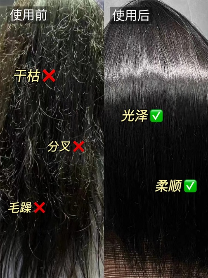 使用感受方面:中规中矩。干发涂多了会结块,梳的时候卡得疼,后来控制量才好点。染烫的地方用了确实不那么分叉,摸起来软一点;但结块问题挺烦,它的分子小但堆起来就粘,还是得少涂。