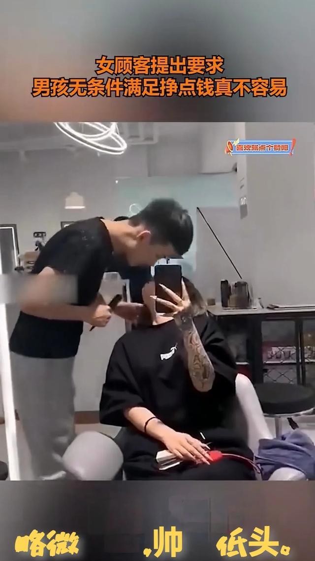 接下来小帅哥的操作更是让你的三观尽灭!原以为帅哥会拒绝的,因为帅哥看着很青涩,是一个年龄不大的极有可能是童工的小帅哥!没想到小帅哥只是略微犹豫就开始下腰低头了!没有一点羞涩的感觉,这时候咱们的美女顾客已经绝对有把握吃定了小帅哥!做好了一切准备!仰头闭眼等待这一吻了!男孩儿不易呀!