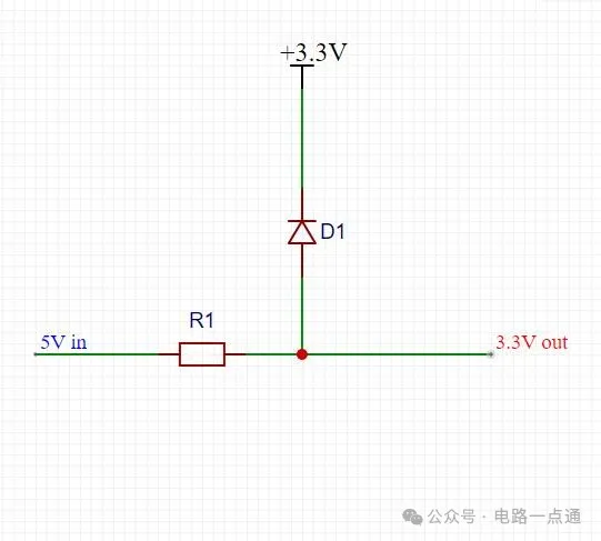 这个电路是通过二极管钳位作用来实现5V至3.3V电平的转换。当5V系统输入高电平时,经电阻R1,再通过二极管D1的钳位作用,使D1的阳极电位保持在3.3+二极管压降的电平(二极管压降选型有要求),即输入5V高电平,输出也是3.3V系统的高电平。