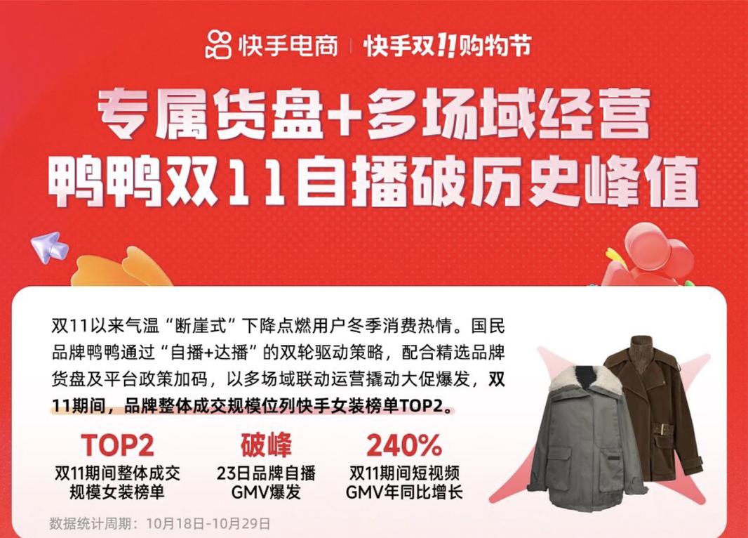 在快手渠道,鸭鸭的销量也同样可观。同样是2025年双十一大促期间,在10月18日到10月29日十天里,鸭鸭品牌整体成交规模已经来到快手女装榜单的TOP2,并且在23日品牌自播渠道的GMV突破了历史高峰。