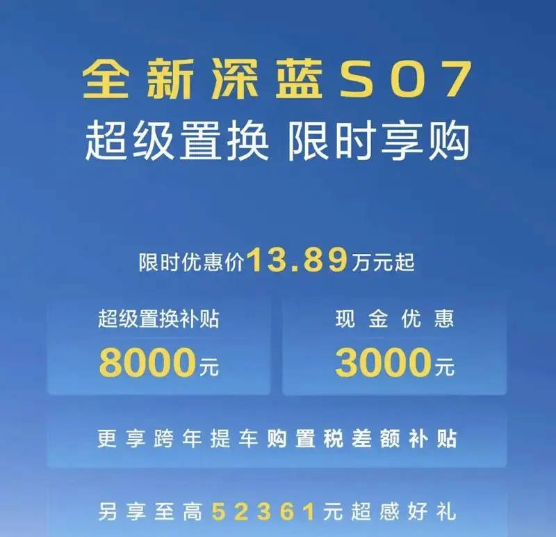 11月24日,深蓝汽车宣布新款深蓝S07超级置换补贴正式上线,包含现金优惠3000元、超级置换补贴8000元,更可享跨年提车购置税差额补贴,限时优惠价13.89万元起。另外还可享至高52361元超感好礼。