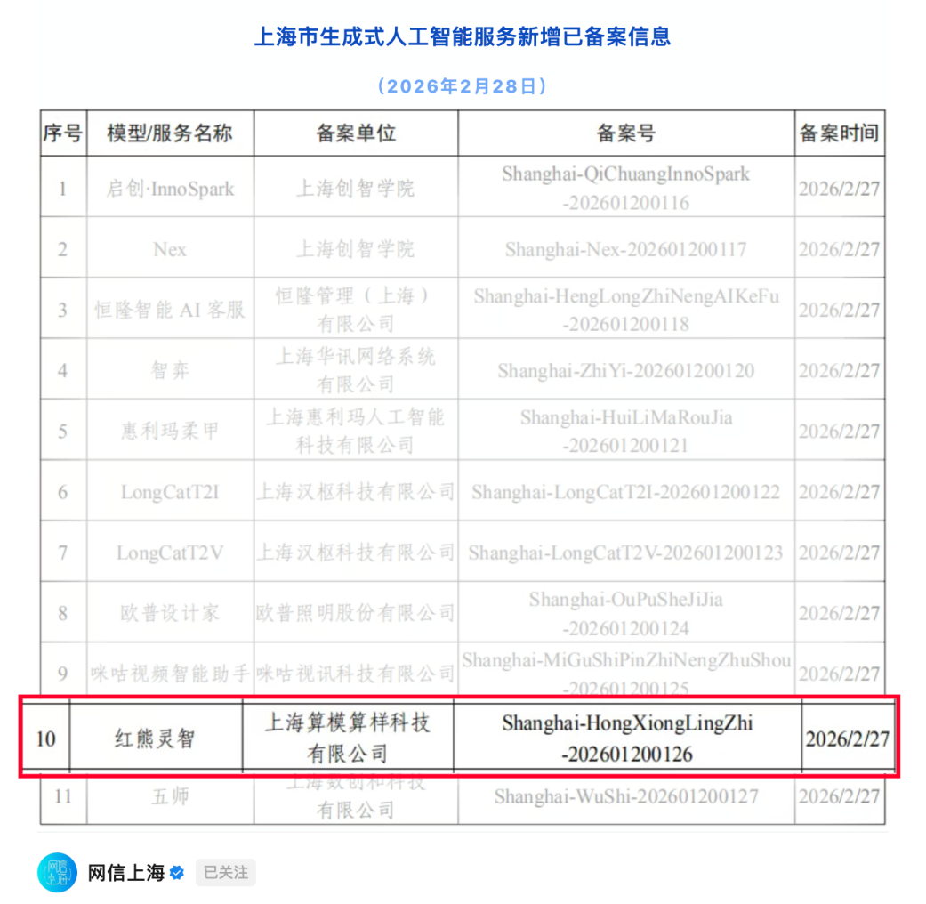 上海算模算样科技有限公司:品牌名称红熊AI,自主研发的红熊灵智全模态大模型,顺利通过国家互联网信息办公室生成式人工智能大模型备案审核,正式获得国家级合规服务资质。