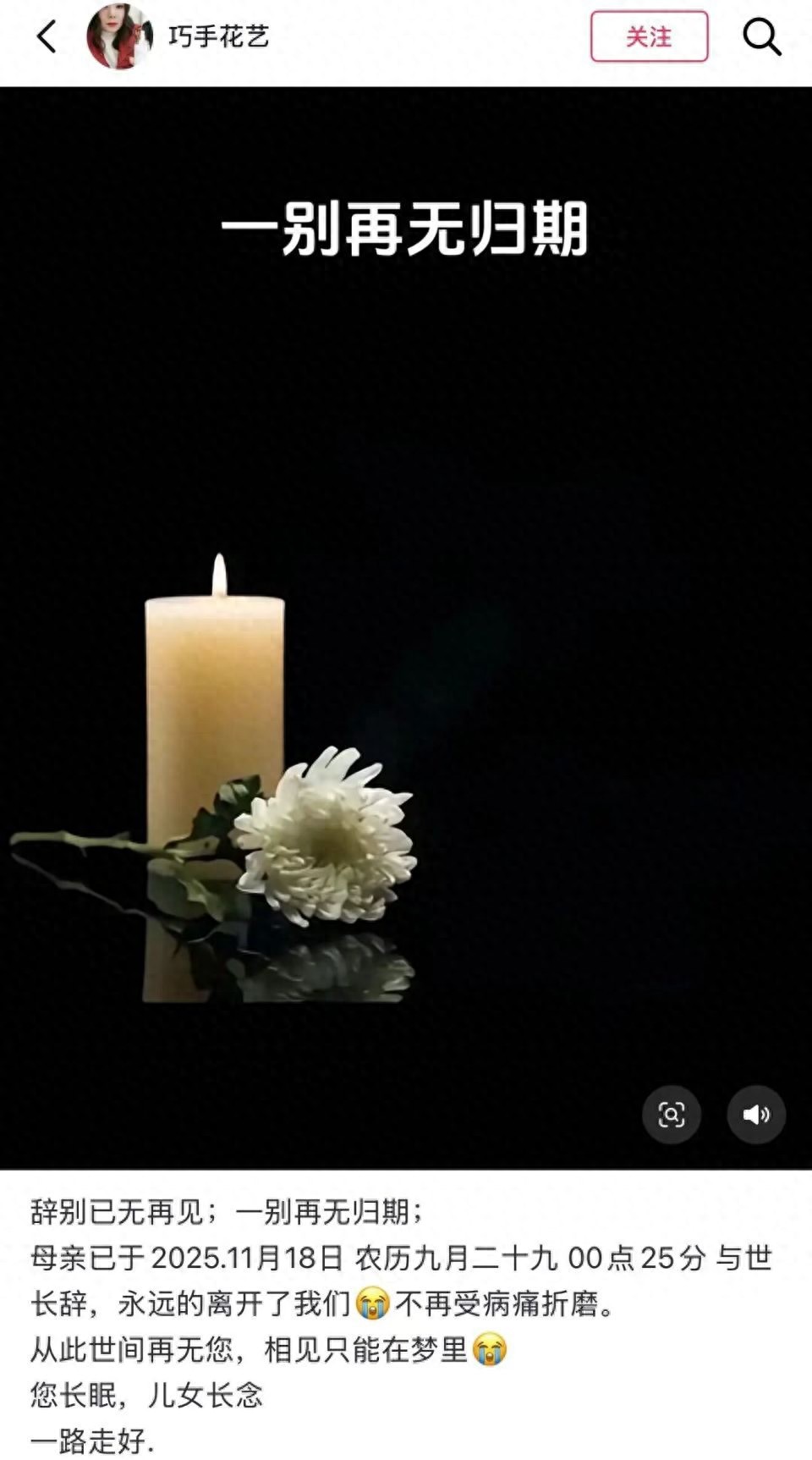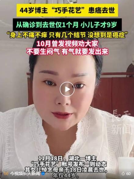 近日,湖北一博主“巧手花艺”患癌去世,其女儿用母亲账号发布一则动态,悼念母亲于18日凌晨去世,年仅44岁。 该博主10月
