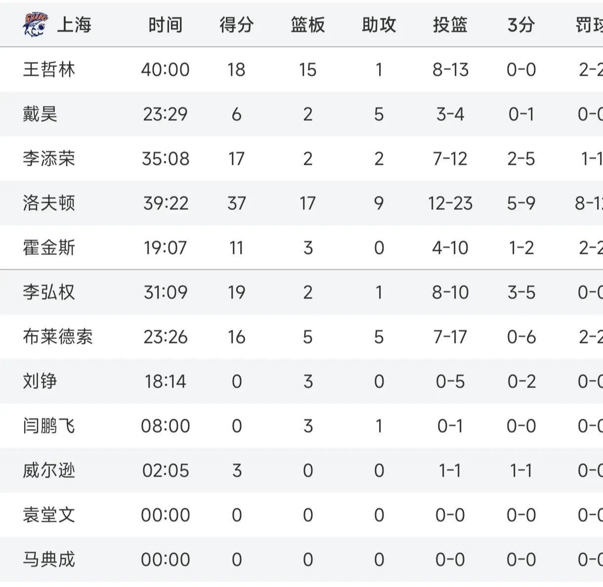 上海方面洛夫洞拿到全队最高的37分,球队一共有6人得分上双,具体数据如下!