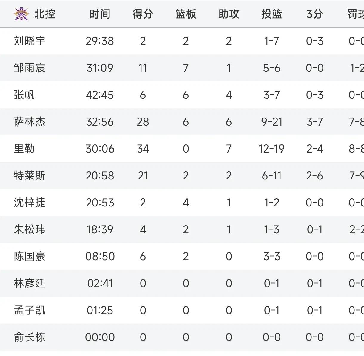 北控方面,里勒拿到全队最高的34分,球队一共有4人得分上双,具体数据如下!