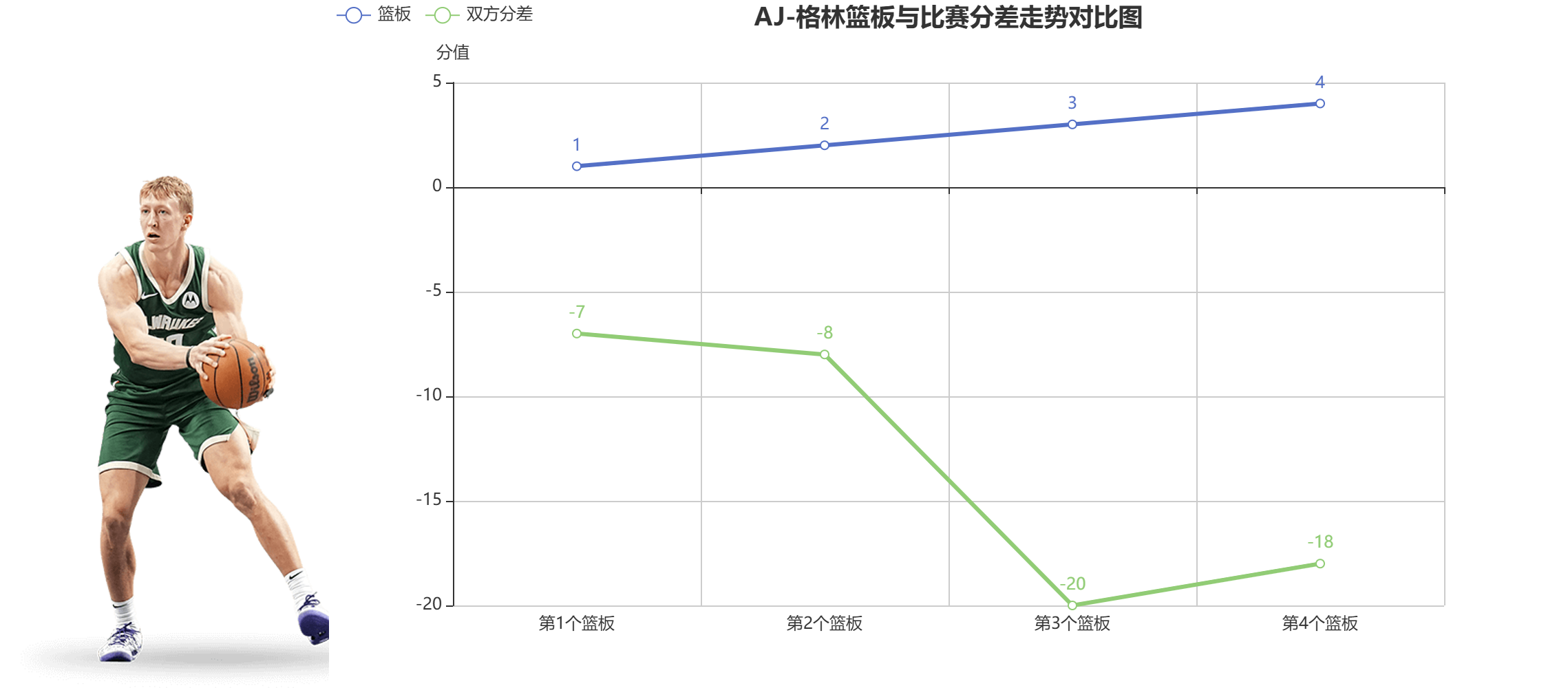AJ-格林收下4个篮板(进攻篮板0个、防守篮板4个),总篮板率从赛季平均水平的场均4.90%增长本场的9.69%。