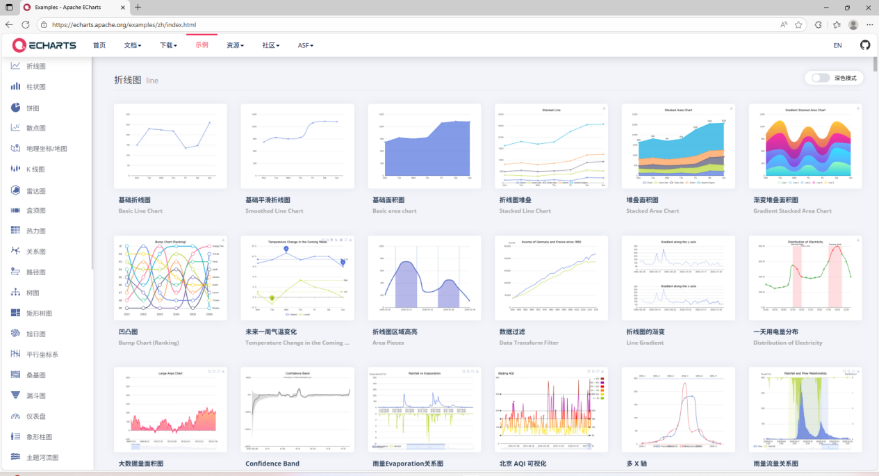 6、echharts没有哪个打工人能拒绝这个免费的数据可视化工具,它把数据可视化做到了淋漓尽致。平台涵盖几乎所有常见图表类型,包括散点图、雷达图、热力图、路径图、柱状图、漏斗图、日历坐标图等,且图表效果美观。兼容大部分浏览器,操作简单,只需选择喜欢的图表类型,将自己的数据填入左侧对应区域,系统就会自动绘制成图表。