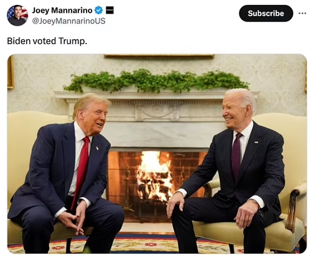 有人说拜登的笑容传达出两党合作的希望,有人脑洞大开,解读为“拜登投票给川普”。前共和党国会议员候选人肖恩·帕内尔在X(原Twitter)上幽默地写道:“拜登和大多数美国人现在拥有同样的笑容——看着川普回归,喜上眉梢。”