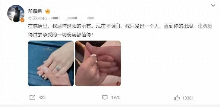 01凌晨四点四十八,鸽子蛋钻戒+拉钩手照,俞灏明一波操作直接把狗粮喂到我们嘴边。
