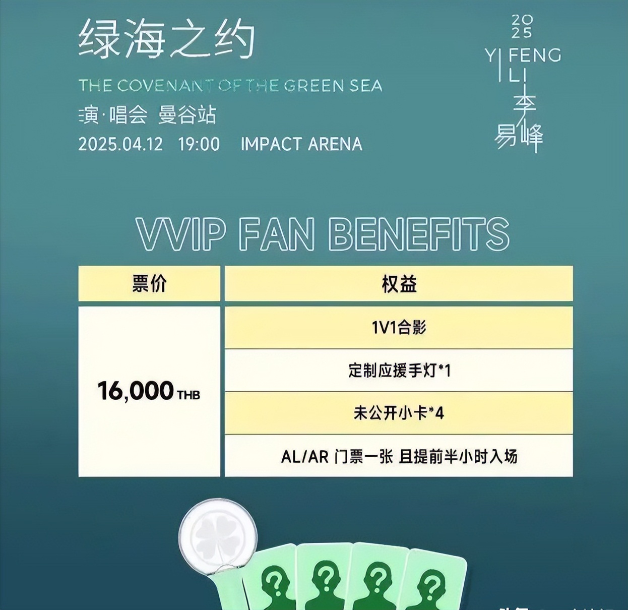 李易峰这次泰国演唱会的票价,直接对标国内顶级歌手。最便宜的看台票约450元,内场票逼近2000元,而VIP票价更是高达3500元。要知道,这个价格已经和周杰伦、张学友这种级别的歌手相当了。