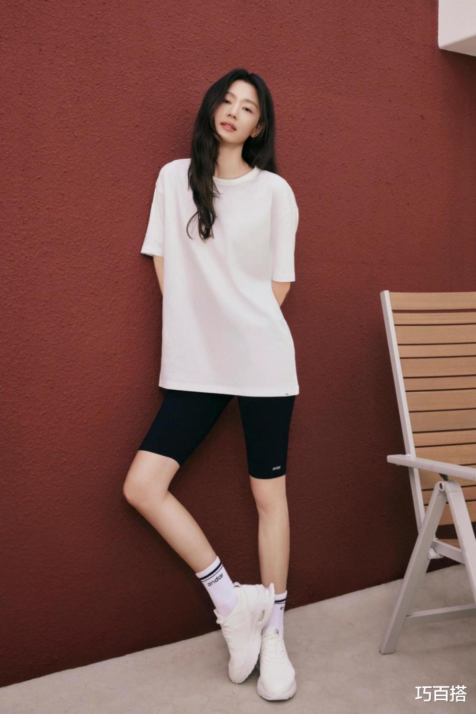 纯白色男友风T恤搭配纯黑色骑行裤,简单利落的款式让她既解放了身材又秀出了完美身材,贼有吸引力。