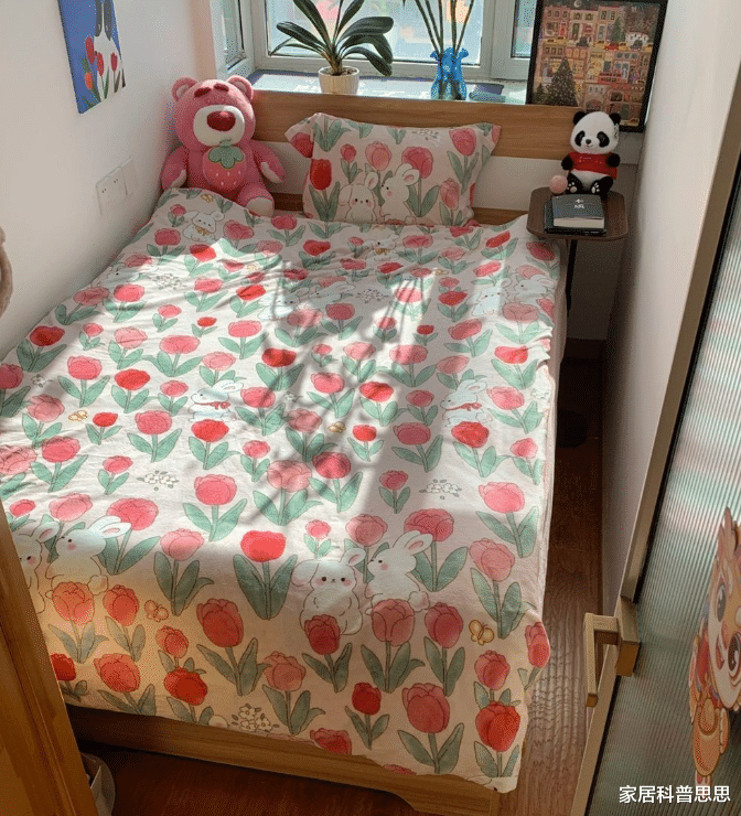 最令人惊叹的是她的两个3㎡小卧室。通过巧妙的隔断,原本的一扇大窗户被分成了两扇小窗户,为狭小的空间带来了自然光和通风。每间卧室都有衣柜,虽然空间不大,但通过合理的收纳,功能依旧得到了最大化的发挥。主卧室中,单人床、边几和窗台的设计使得这个小空间充满了生活气息,早晨的阳光洒进来,散发着温暖与舒适。
