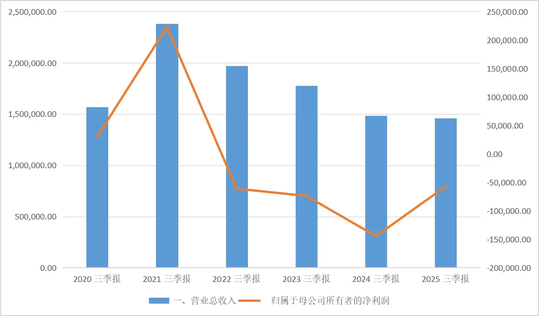 2025年前三季度实现营业总收入146.17亿元(同比下降1.39%),归母净利润-5.72亿元(同比上升60.43%),扣非净利润-6.06亿元(同比上升58.27%)。